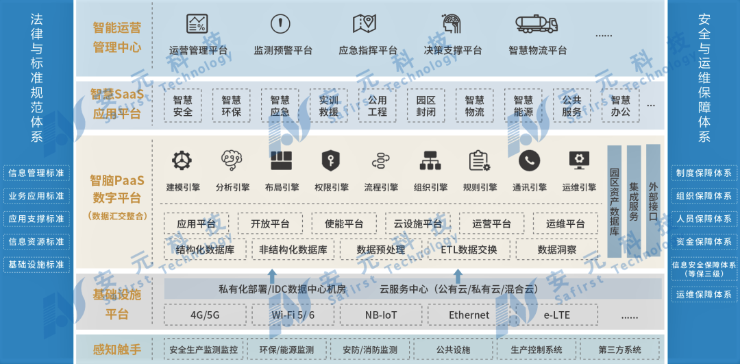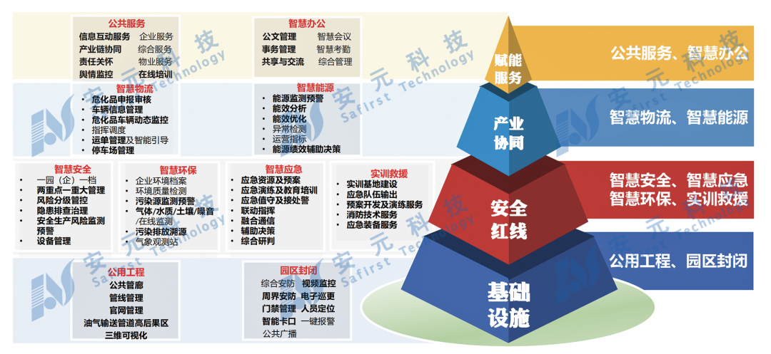 安元·智慧化工园区总体架构主要通过智慧安全、智慧应急、智慧环保、智慧能源、智慧安防等产品构建。