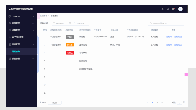 关联智能巡检系统,实时获取巡检计划、巡检任务,检测巡检任务任有没有准时、到位执行巡检任务,并给出偏离路线、任务未完成、未到巡检点等类型报警。