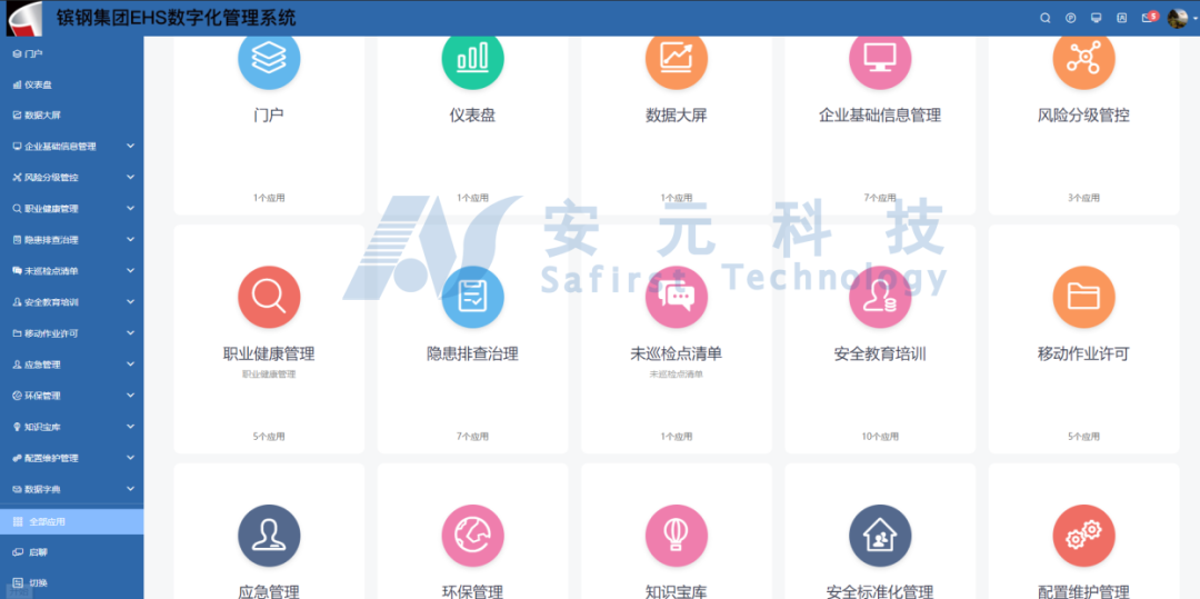 平台包含9个模块:企业基础信息管理、风险分级管控、隐患排查治理、职业健康管理、安全教育培训管理、移动作业许可、应急管理、环保管理、安全标准化管理和安全知识库模块。