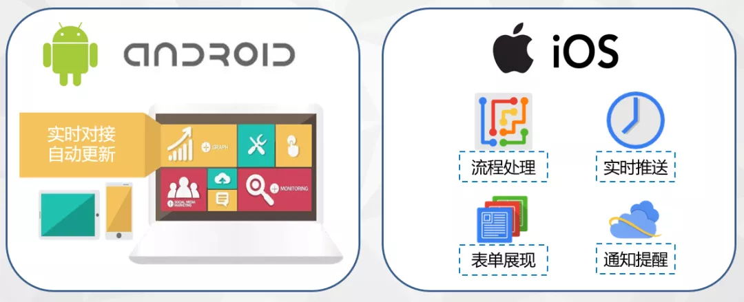 平台包含配套的移动应用终端,移动终端的应用与云平台中心实时对接,保证云平台更改业务后,移动端能够实时自动更新。