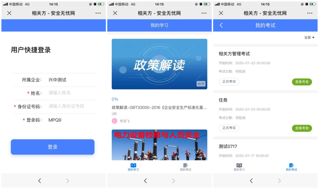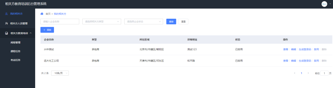 后台:相关方企业管理、相关方人员管理、学习任务管理、考试任务管理、报表统计